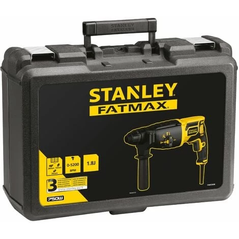 750 W, vitesse 0-1050 tr/min Cadence 0-5200cps/min, énergie de frappe 2,7J, perçage Béton 26 / Acier 13 / Bois 30 mm. Le perforateur STANLEY FATMAX est un outil puissant avec son moteur de 750W pour percer des trous et la fixer des chevilles dans le béton. 3 modes de perçage sont disponibles, le perçage, la perforation et le burinage. Il est facile à prendre en main grâce à sa poignée ergonomique revêtement caooutchouc pour une utilisation facilitée. Pour de meilleurs résultats, utiliser avec le coffret de 12 forets SDS de 6-14mm STANLEY STA56119-QZ.