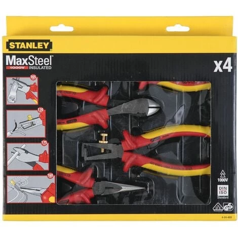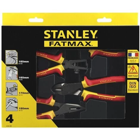 Depuis 1843, STANLEY® est le partenaire privilégié des professionnels. Leader du secteur en matière d’innovation, STANLEY® travaille aux côtés d’experts en outillage et développe des outils dans un souci d’excellence pour en faire «?LA RÉFÉRENCE PRO?». Fière de sa réputation d’excellence, la marque met tout en œuvre pour tester, concevoir et améliorer en permanence ses produits, afin de garantir une qualité et un fonctionnement optimal. STANLEY® a fabriqué certains des outils les plus innovants et utiles au monde, comme par exemple le rabot Bailey®, la lime Surform®, le mètre à ruban PowerLock® ou encore la toute dernière gamme de produits FATMAX®. Le coffret de 4 Pinces isolées 1000 V 4-84-489 de STANLEY présente plusieurs outils qui feront le bonheur des professionnels et notamment des électriciens en répondant à tous leurs besoins. Ainsi, le coffret contient une pince universelle dont les fonctions sont variées comme couper des fils, serrer deux objets ou un écrou, mais elle peut aussi être utilisée comme tenaille, une pince coupante diagonale dont la courbure réduit vos efforts et permet de couper des cordes de piano entre autres, une pince à bec long droit pour les pièces de petite taille et dont la forme lui permet de se faufiler dans les petits espaces et une pince à dénuder, idéale pour dénuder proprement les fils électriques sans les abîmer. L’ensemble de ces outils vous permet de parer à toutes les situations que vous pouvez rencontrer. Par ailleurs, le coffret de 4 Pinces isolées 1000 V 4-84-489 de STANLEY propose des outils de qualité avec des taillants trempés haute fréquence pour être efficaces sur des fils allant jusqu’à 200 kg/mm² et chaque poignée est certifiée 1?000 V. Enfin, la conception bi-matière vous garantit une bonne prise en main des pinces afin de travailler dans les meilleures conditions.