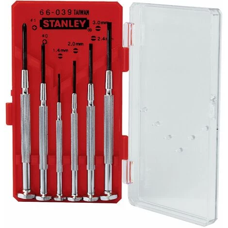 Depuis 1843, STANLEY® est le partenaire privilégié des professionnels. Leader du secteur en matière d’innovation, STANLEY® travaille aux côtés d’experts en outillage et développe des outils dans un souci d’excellence pour en faire «?LA RÉFÉRENCE PRO?». Fière de sa réputation d’excellence, la marque met tout en œuvre pour tester, concevoir et améliorer en permanence ses produits, afin de garantir une qualité et un fonctionnement optimal. STANLEY® a fabriqué certains des outils les plus innovants et utiles au monde, comme par exemple le rabot Bailey®, la lime Surform®, le mètre à ruban PowerLock® ou encore la toute dernière gamme de produits FATMAX®. Le tournevis horloger Coffret de 6 pièces 1-66-039 STANLEY contient 4 tournevis horlogers à empreinte Phillips de 1,4?; 2?; 2,4 et 3 mm de dimensions, et 2 tournevis à empreinte Pozidriv n° 0 et n° 1, pour convenir à une multitude de gabarits de micro vis. Ils sont extrêmement fins et assez longs pour accéder efficacement aux vis situées en profondeur et dans des zones confinées. Sa poignée hexagonale et sa tête pivotante assurent une prise en main ferme et agréable, pour manier les tournevis confortablement, et bénéficier d’un mouvement de rotation efficace. Ils sont protégés contre l’usure et l’oxydation, grâce à sa lame trempée et bleuie, et son manche nickelé et guilloché, pour une résistance à toute épreuve et une durée de vie plus longue. Ils sont rangés dans un coffret compact pour éviter qu’ils s’éparpillent dans un sac à outils et simplifier leur transport. Celui-ci comporte des repères pour sélectionner facilement et rapidement l’empreinte et la taille du tournevis à utiliser.